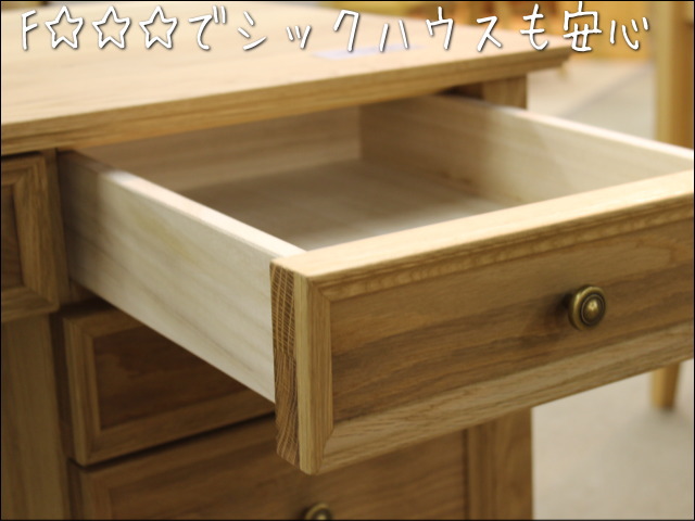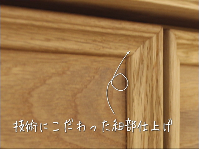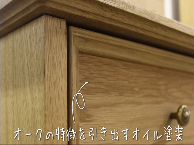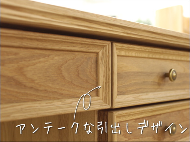 引出しの前板は、木目のはっきりしたオーク材で、端の方を細工した作りにしています。