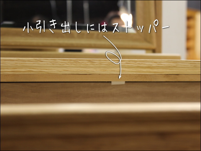 小引き出しにはレールがついていませんが、ストッパーで引出しが落ちないようにしています。