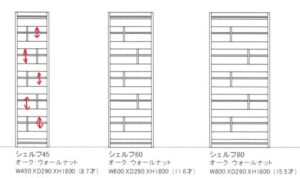 上記のリビングシェルフは、赤矢印部分の棚板が可動棚となっております。