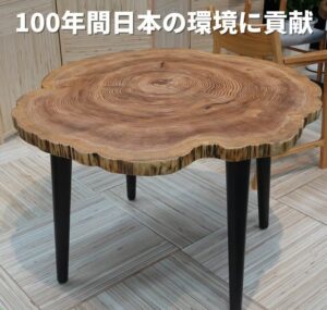 樹齢約100年の小国杉を使用した直径100センチ程の丸太テーブル