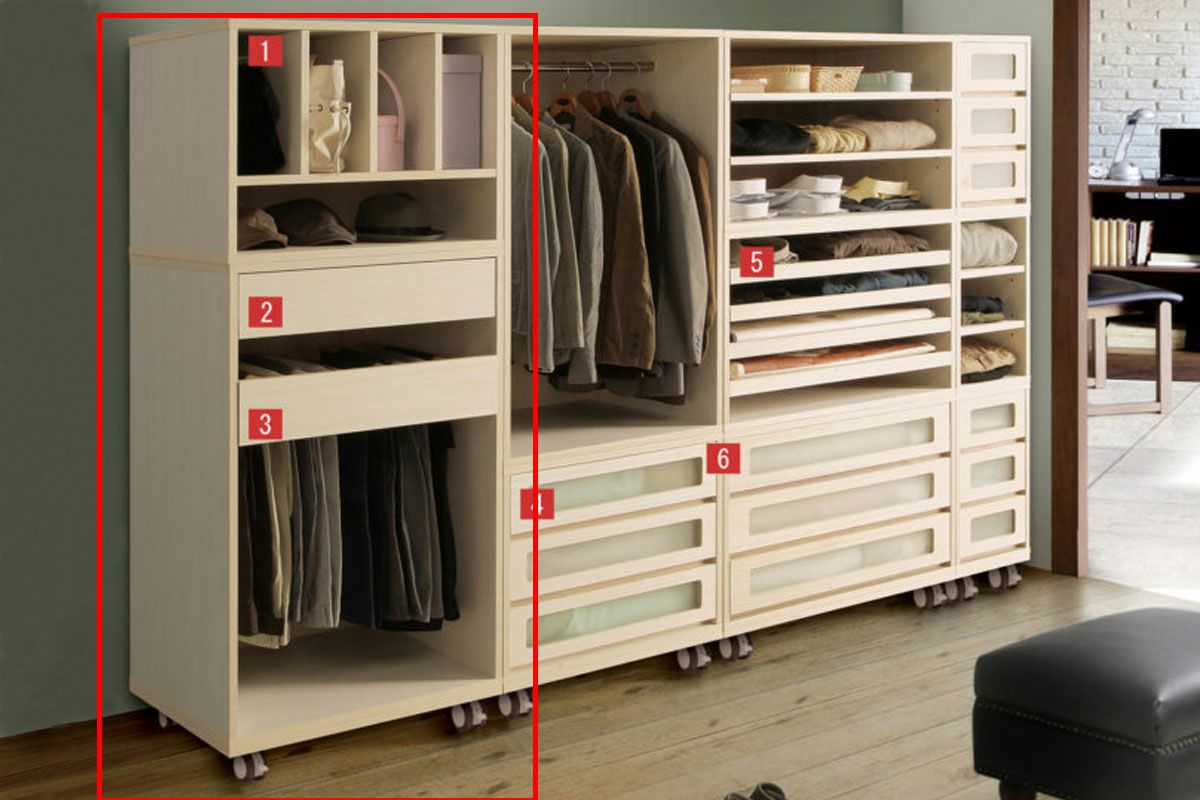 ウォークインクローゼットって収納力があると思われるのですが、 ハンガーパイプだけだと意外と収納の効率が悪いものです。 そんなウォークインクローゼットを有効活用していない方のために、 ウォークインクローゼット用の小物やスラックスなども専用に収納する ウォークインクローゼット収納ユニット家具がおすすめです。 幅も3種類から選べ、高さもクローゼットに合わせて組み合わせができます。 |