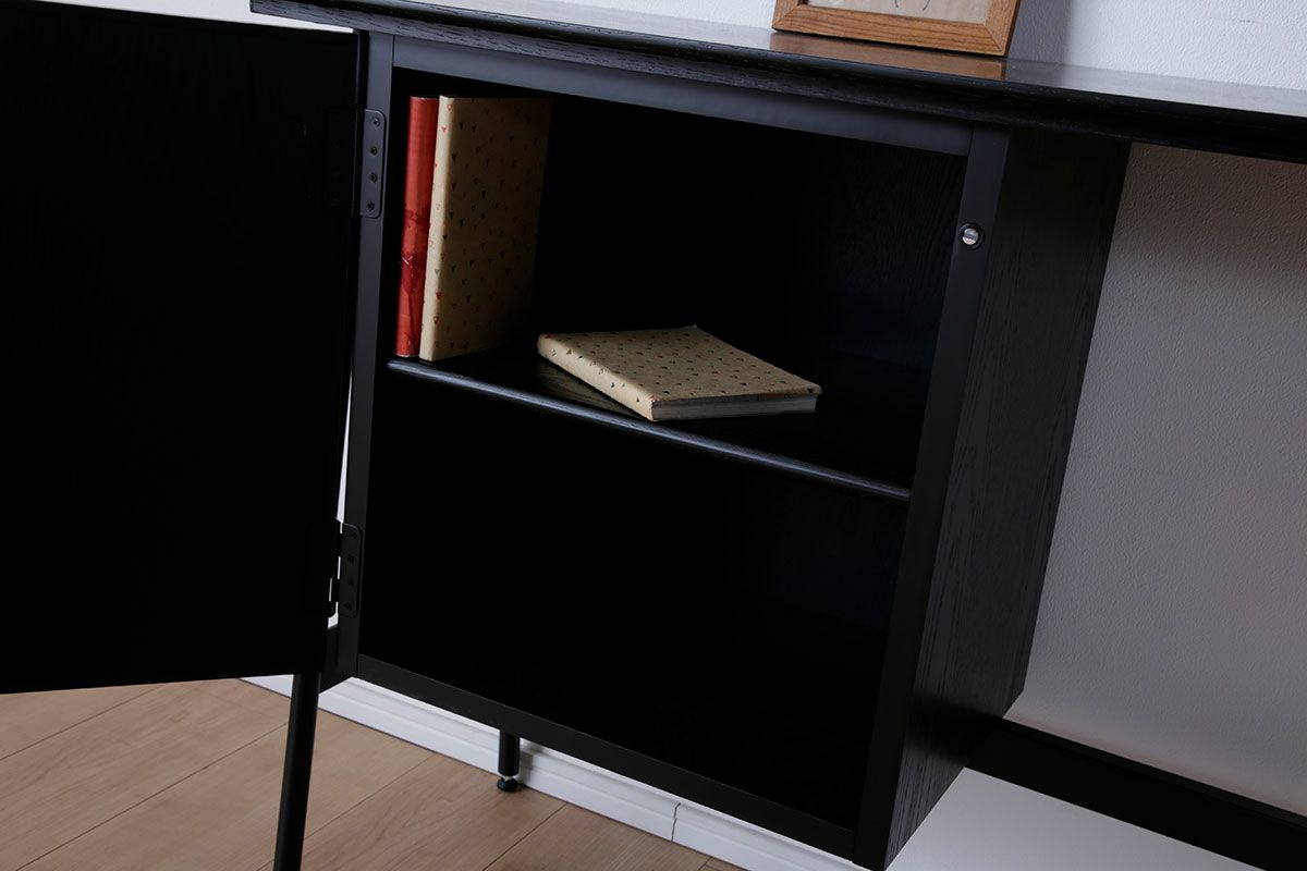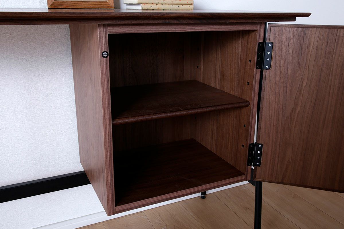 テーブルの天板やキャビネットで裏側も化粧仕上げをし、背面が見えてもおかしくない商品。