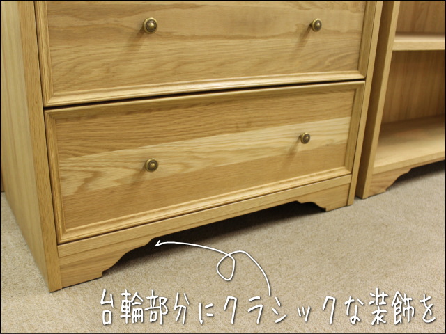 引出しの前板は、木目のはっきりしたオーク材で、端の方を細工した作りにしています。