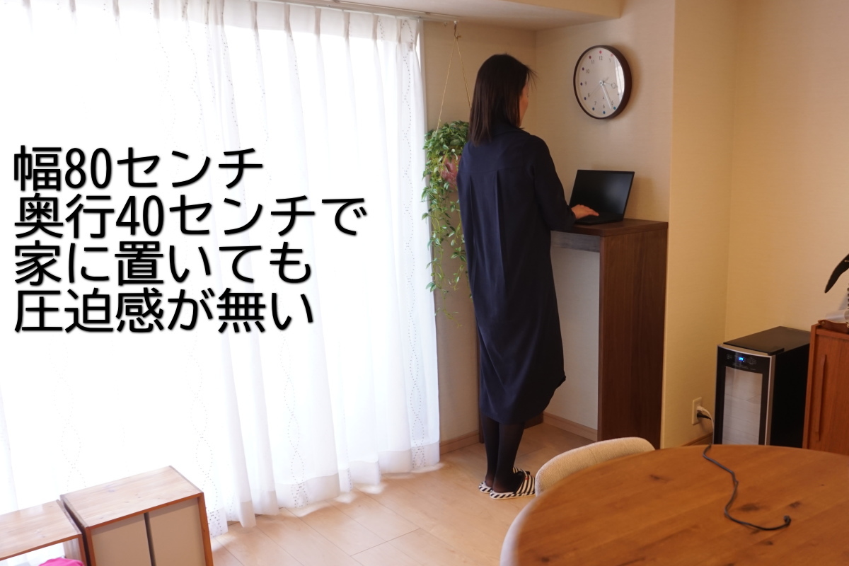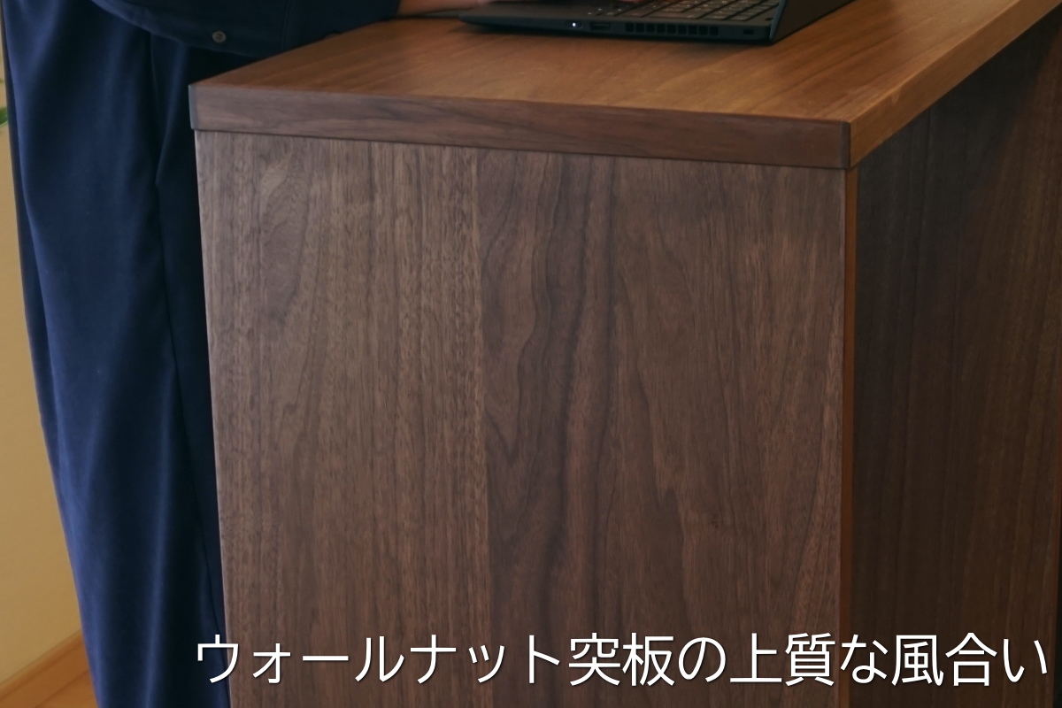 ウォールナット天然木スタンディングデスクの特徴 ・人気の天然木ウォールナット材を全面に ・小口面はウォールナット無垢材を使用 ・身長170センチ前後に合わせた110センチ高 ・奥行き40センチで家でも圧迫感がない ・A4ノートPCがジャストサイズ ・家においても違和感のない質感 ・F☆☆☆☆でシックハウス症候群も安心 だから テレワークでお家時間が増えて立って仕事がしたい人におすすめ ・人気の天然木ウォールナット材を全面に このスタンディングデスクは、ウォールナットつき板を 天板、側面はもちろん、内側の面にも貼っています。 ですので、どこを見ても天然木ウォールナットで、 上質な質感になっています。 テレワークはもちろん自宅ですので、 安っぽい質感のものや金属むき出しみたいなスタンディングデスクは、 お部屋のインテリアと合わせにくいですよね。 ・小口面はウォールナット無垢材を使用 小口面(板の断面)にはウォールナット無垢材を5ミリほど切り出したものをつけています。 小口面はよくあるのは、つき板テープを張っているものが多いのですが、 このスタンディングデスクは無垢材を貼っています。 ですので、より上質な風合いになっています。 ・身長170センチ前後に合わせた110センチ高 このスタンディングデスクは、もともとモデルになってくれている 女性経営者からの依頼で作成しました。 テレワークになって、家にずっといると運動不足になるので、 たまには立って仕事をしたい。 ということでした。 ですので、この女性経営の身長に合わせて、 高さ110センチで作成しました。 身長170センチ前後の方に合う高さになっています。 ・奥行き40センチで家でも圧迫感がない 大きさは、幅80センチ、奥行き40センチ、高さ110センチです。 もともとこの女性経営者のこのスペースに合うようにと作っています。 オーダーで大きさの変更も可能ですので、 お家のスペースに合わせて作成いたします。 (別注ですので価格は要お見積り、定価の1.5倍ほどが目安です) ・A4ノートPCがジャストサイズ 奥行き40センチですので、A4ノートPCも丁度いい感じにおけます。 パソコンだけで仕事ができる方には大きくもなく丁度いいサイズではないでしょうか? ・家においても違和感のない質感 天然木を使用していますので、お家に置いても違和感なくお使いいただけます。 ・F☆☆☆☆でシックハウス症候群も安心 使用素材は、接着剤、塗装、ベニアともにF☆☆☆☆を使用していますので、 シックハウス症候群などが心配な方にも安心してご利用いただけます。 (F☆☆☆☆は低ホルムアルデヒドの最高ランクですが、ホルムアルデヒドの放出量が0ではございませんので ご了承ください)