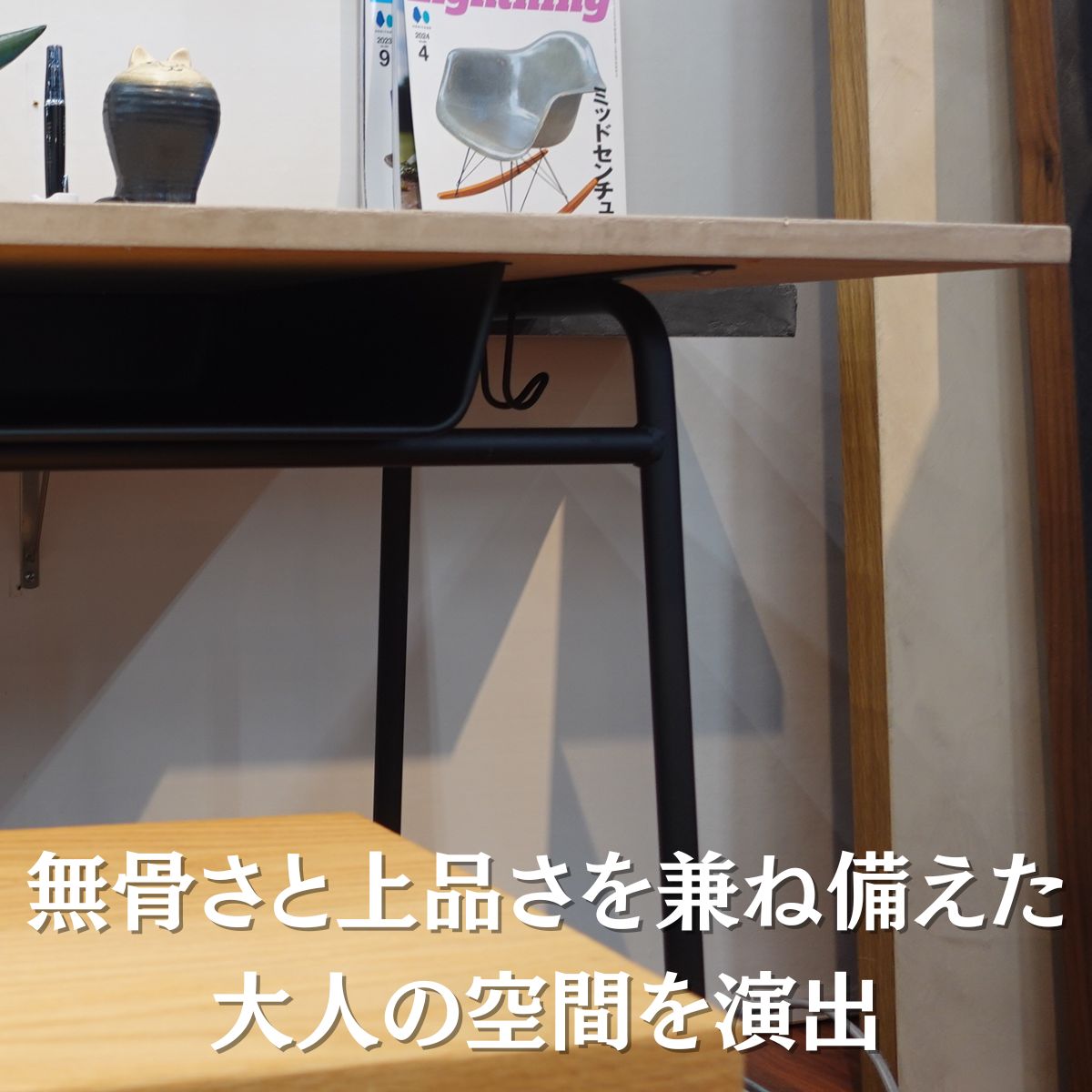 モールテックス天板の重厚感に、マットなアイアン脚を組み合わせたスタイリッシュなデザイン。 無骨さと上品さを兼ね備えた大人の空間を演出します。 どんなインテリアにも馴染み、カフェ風・インダストリアル・ナチュラルモダンにも相性抜群。