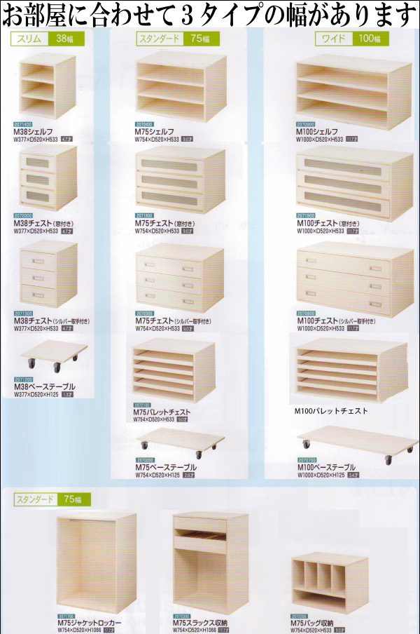 上の写真のように、幅3タイプごとに様々な種類の収納ユニット用意していますので、