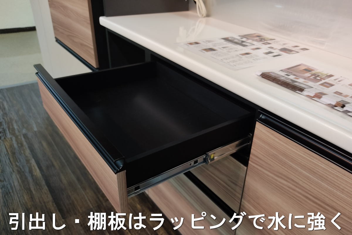 引出し・棚板は桐無垢むき出しではなく、ラッピングで水に強くしています。