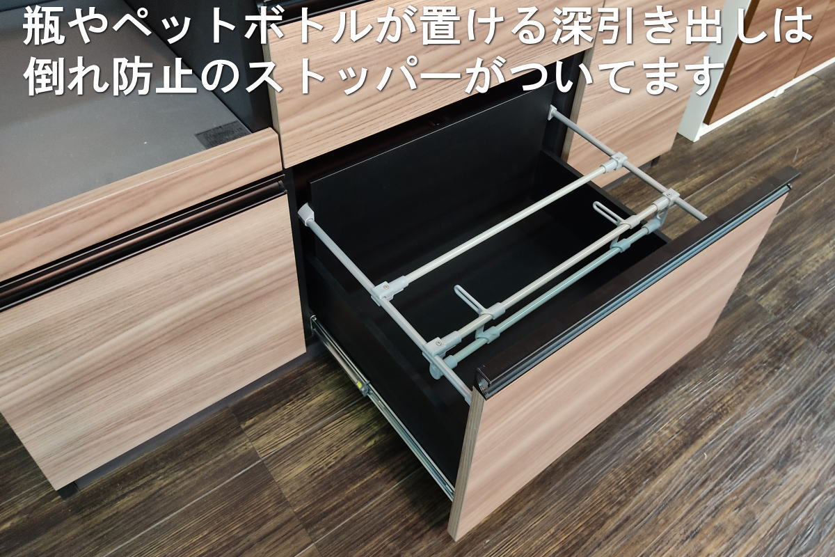そういったボトルの転倒防止のストッパーを深引き出しに採用しています。