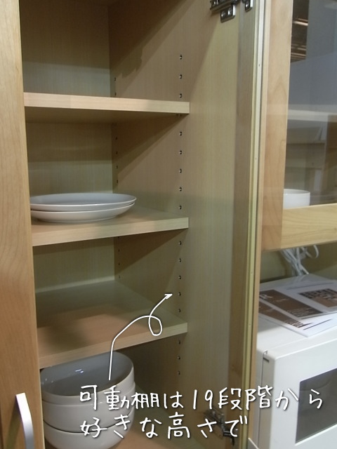 可動棚は、19段の棚ダボが付いています。(カップボードと引出し食器棚)