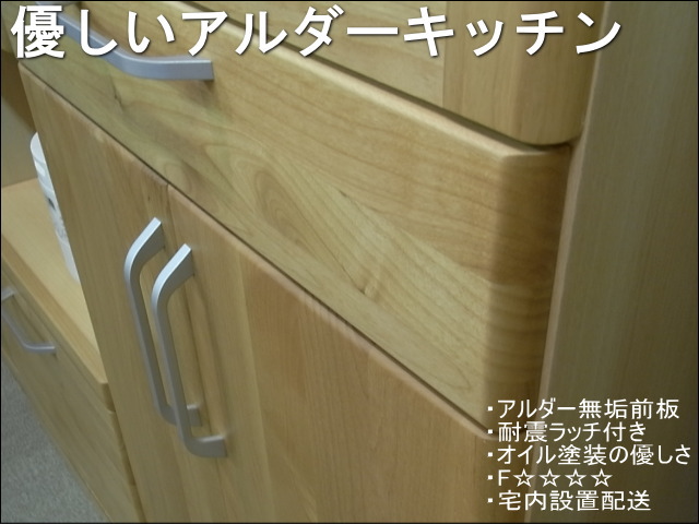 前面にアルダー無垢集成材を使用したキッチン収納です。