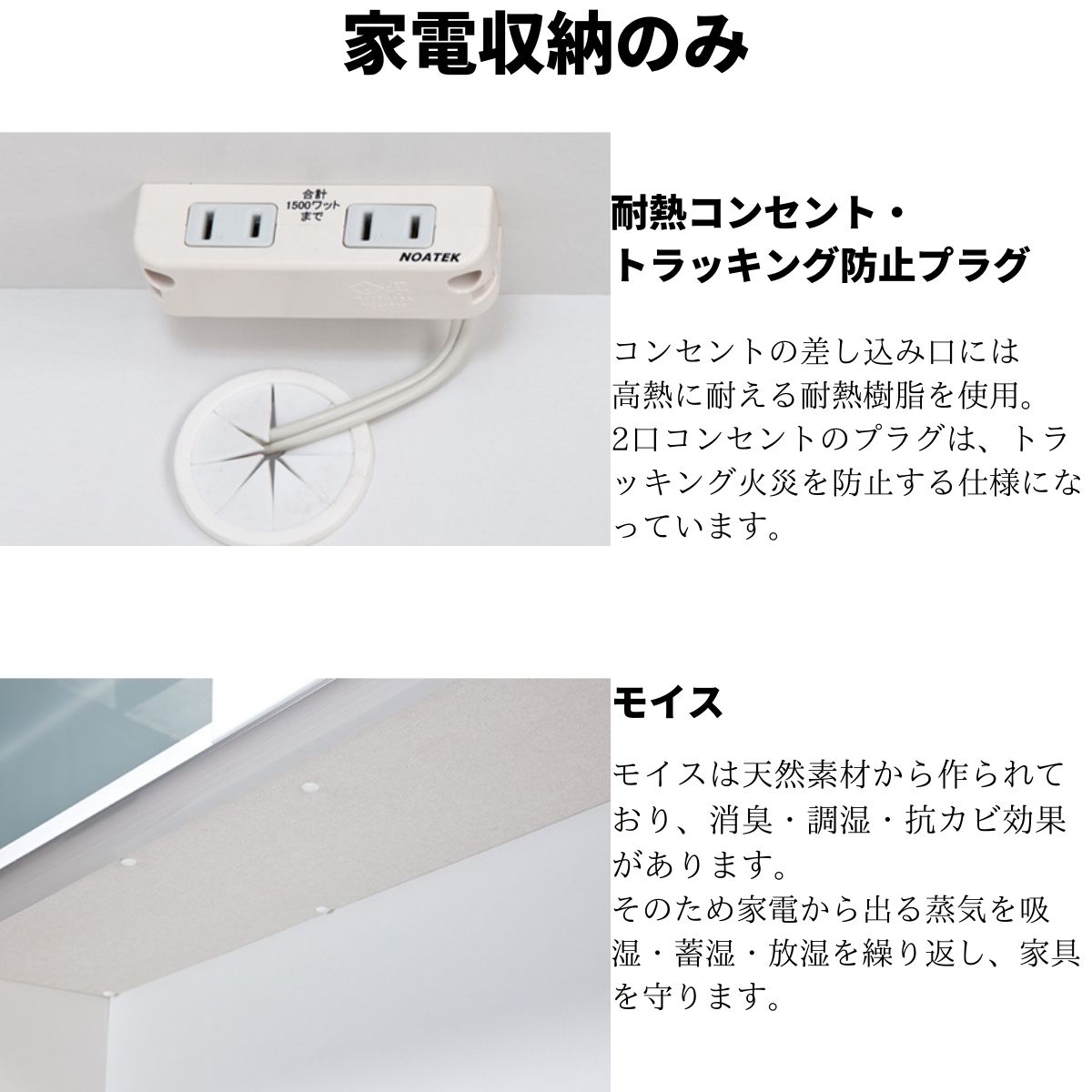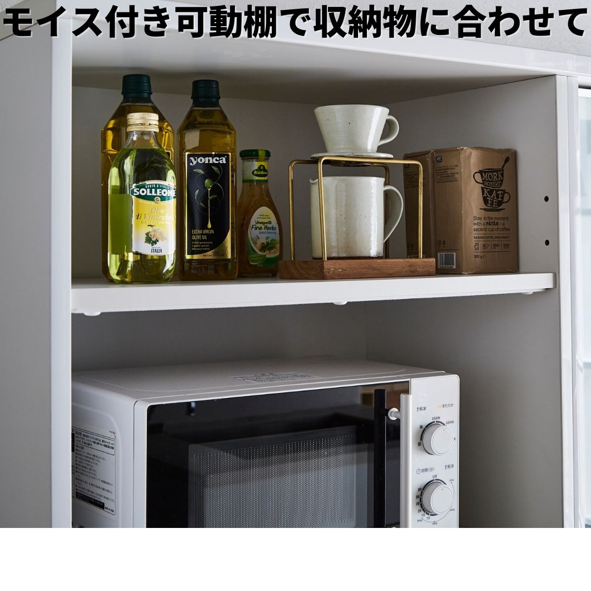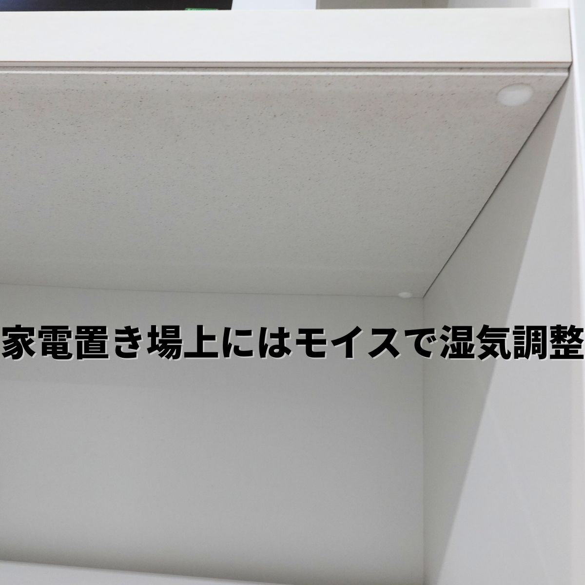 電子レンジなどを置くスペースの上の棚の下にモイスを貼り、棚板の劣化防止に