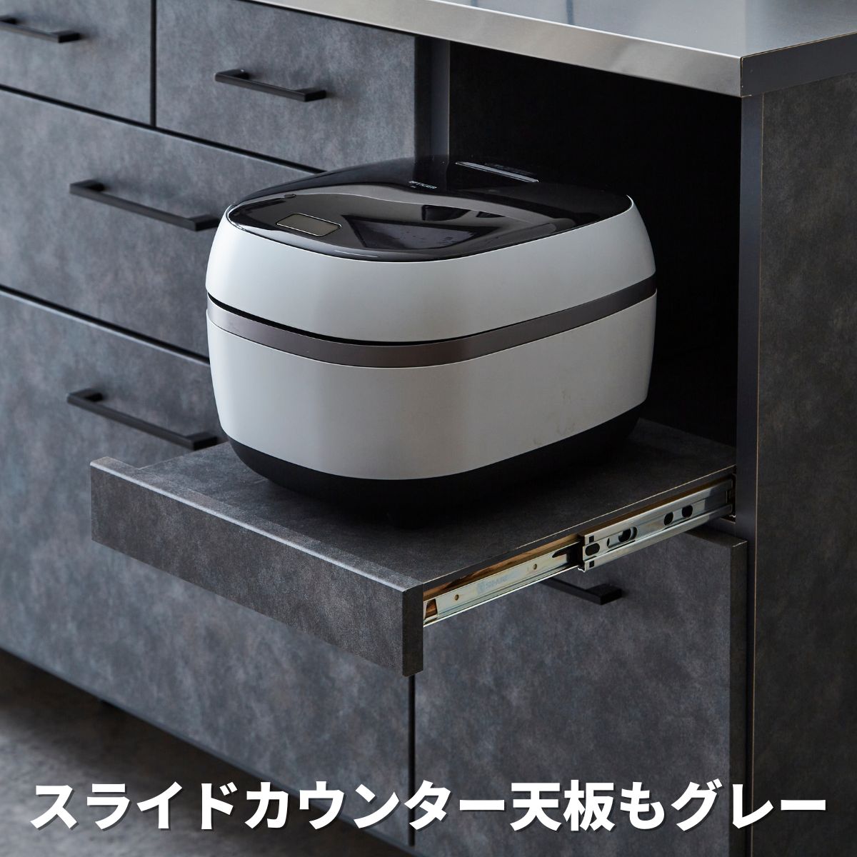 前面・側面は最近人気のグレー色で石目調の柄が入ってます。グレーはシンプルな色なので、飽きが来にくく、他のアイテムを変えるだけで模様替えができます。また、組み合わせの幅が広く、丈夫な国内工場組立により長く使えると思います。