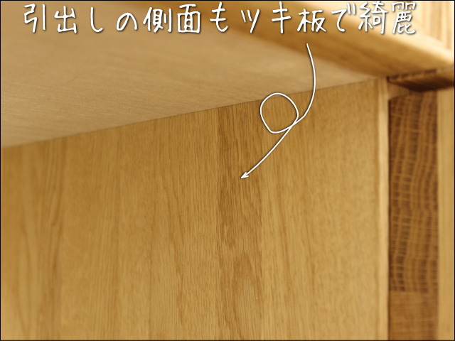 脚を入れる側の引出し側面にも天然木のオークつき板を使用していますので、