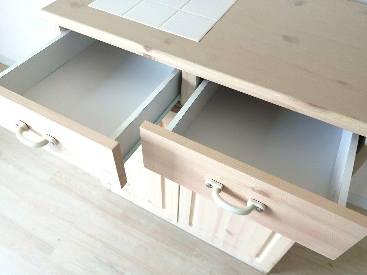 | テーブルの天板やキャビネットで裏側も化粧仕上げをし、背面が見えてもおかしくない商品。 | |