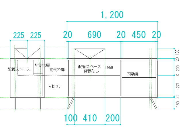 後ろに配管があるのでちょっと奥行きは少なめです。