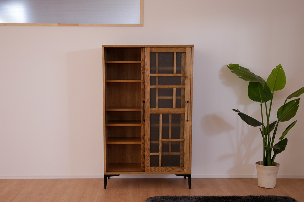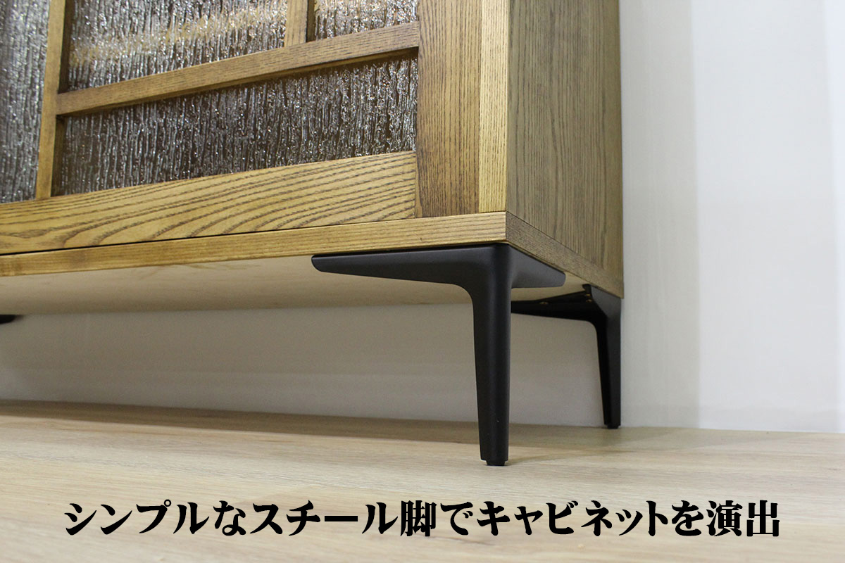 どこか昔の欄間格子をイメージさせる引き違いの戸に、シンプルなスチールの脚や取っ手を組み合わせしてます。