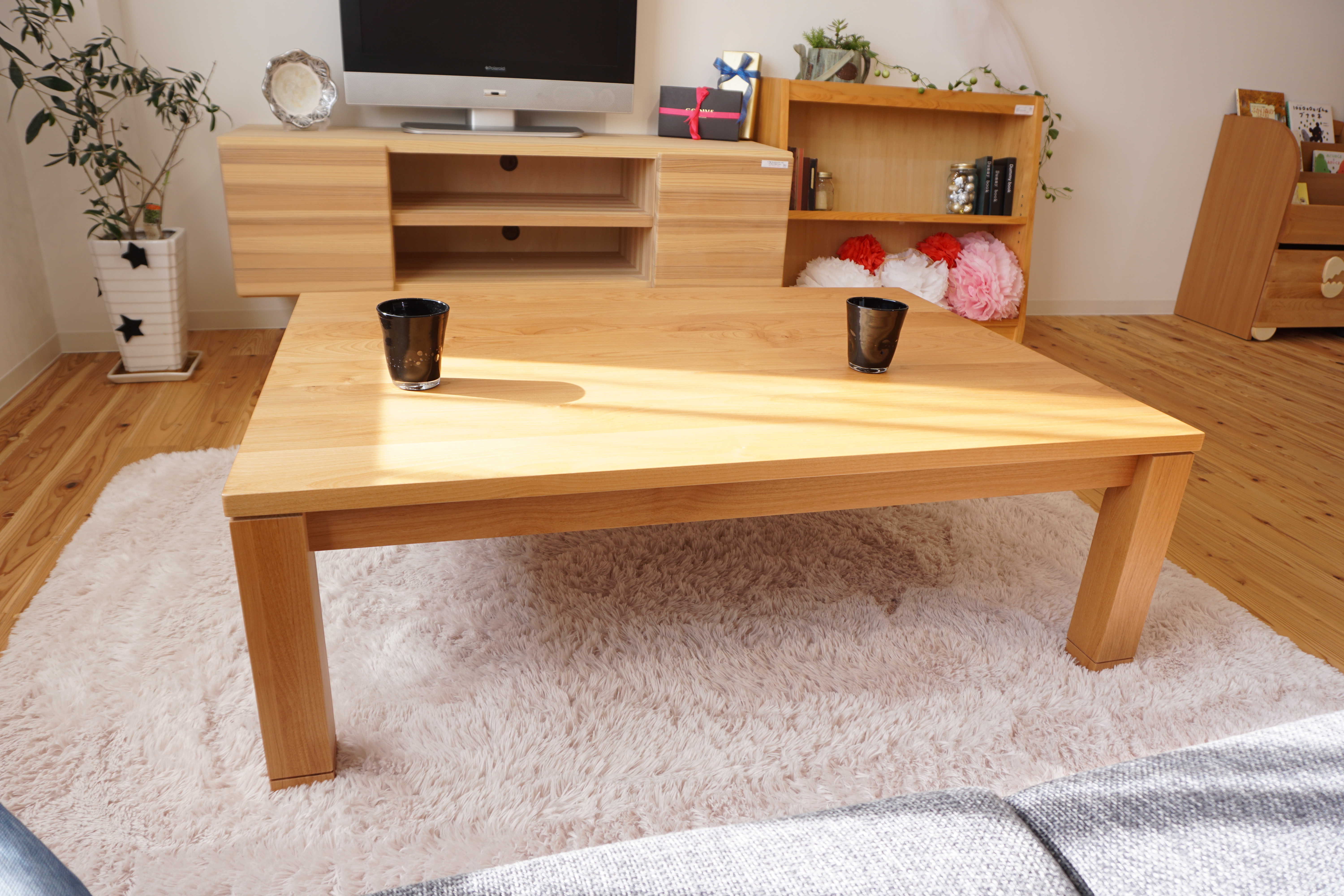コタツっていいですけど、質感がそんなにいいものは少なく、天然木でもつき板のこたつだったり、