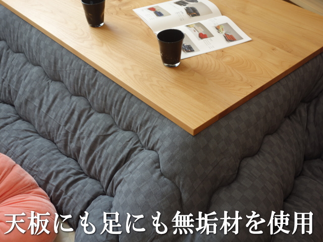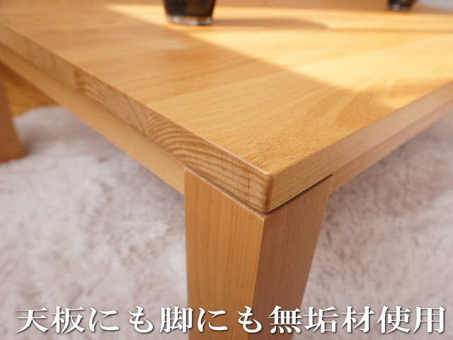 このこたつは、天板にも脚にも同じ樹種の天然無垢材を使用しています。