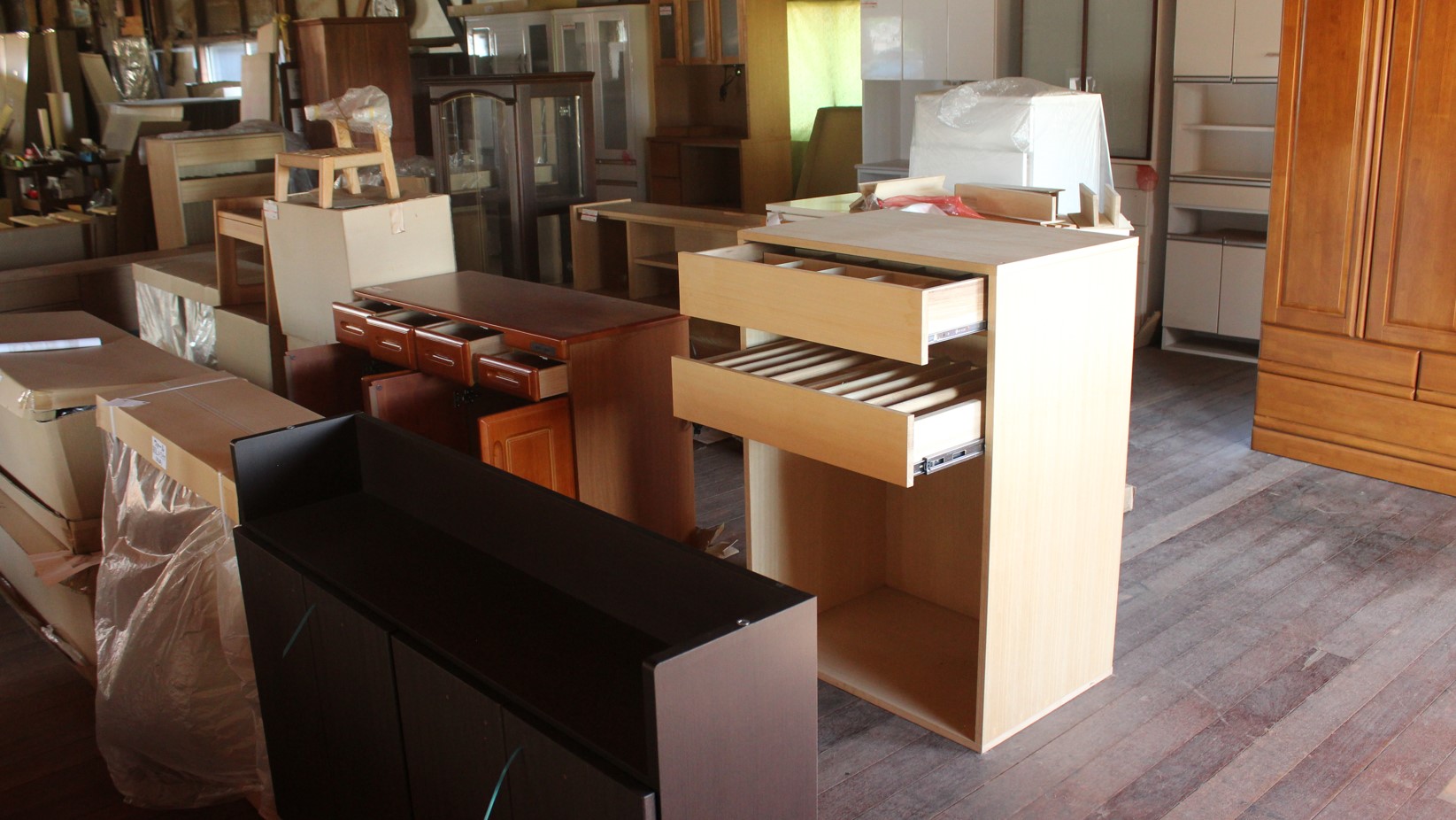 ご注文いただいた家具は、一旦梱包を解き、引き出しや扉などを開いて通気性の良い倉庫で保管しホルムアルデヒドが効果的に発散される環境を提供します。期間は最低1週間換気します。