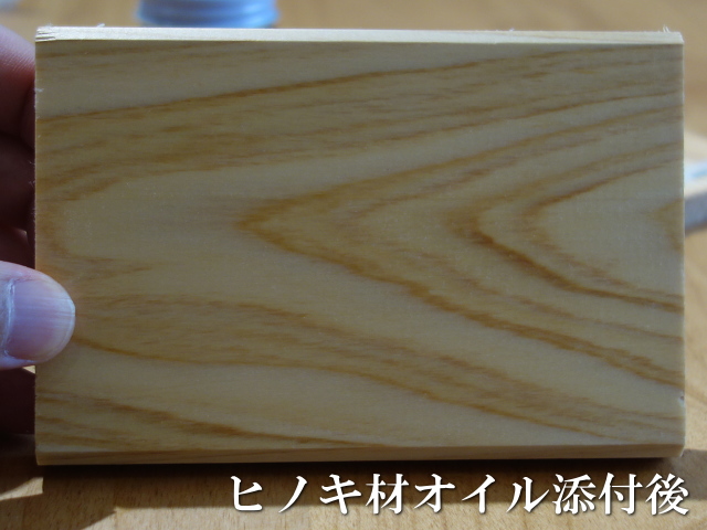 上と下は同じヒノキ材の無塗装状態とオイル添付後の写真です。