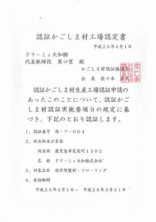 鹿児島県産杉使用の証明書です。