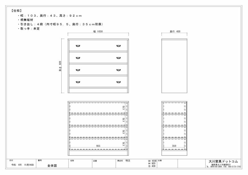 ・引き出し:4段(内寸幅:95.5、奥行:35cm確保)