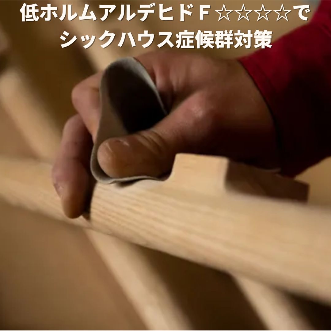 使用素材は、木材・接着剤・合板・塗装ともにホルムアルデヒド放出等級最高ランクのF☆☆☆☆を使用しています。