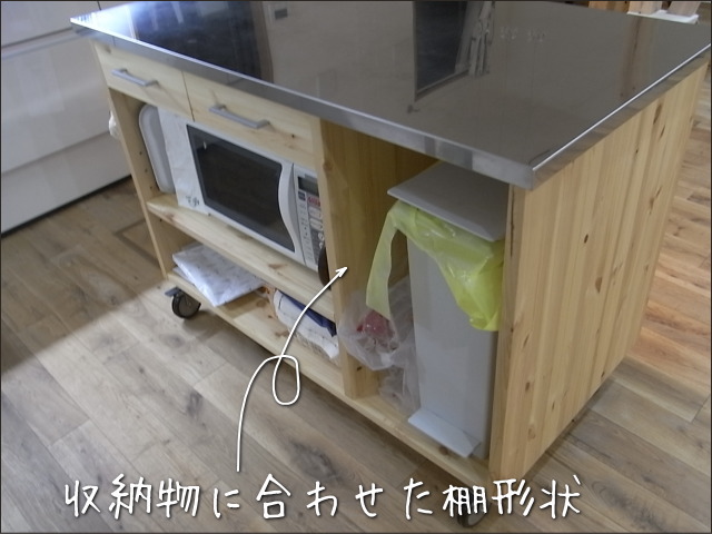 私の自宅では、ゴミ箱とレンジを収納したいと思っていましたので、棚をこういう形状にしました。