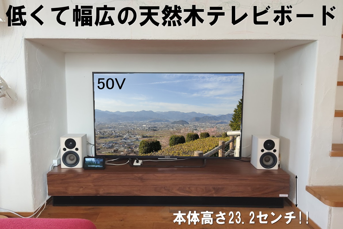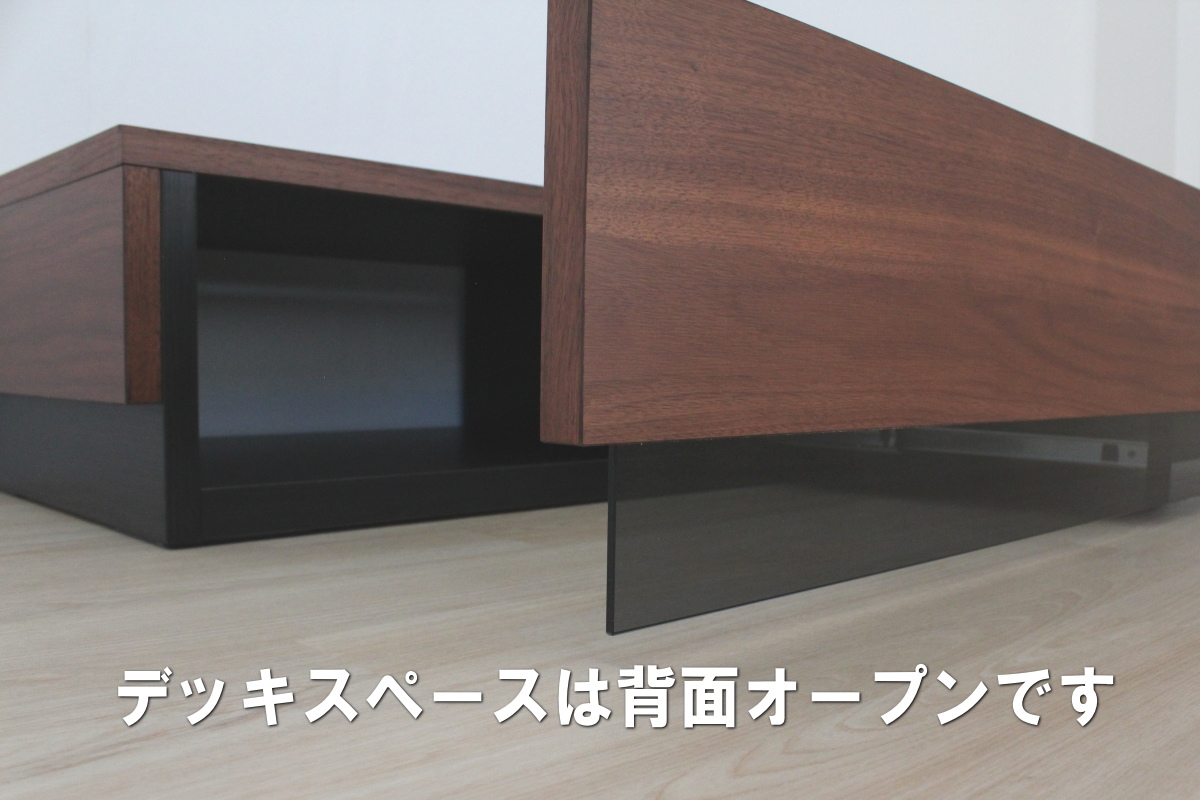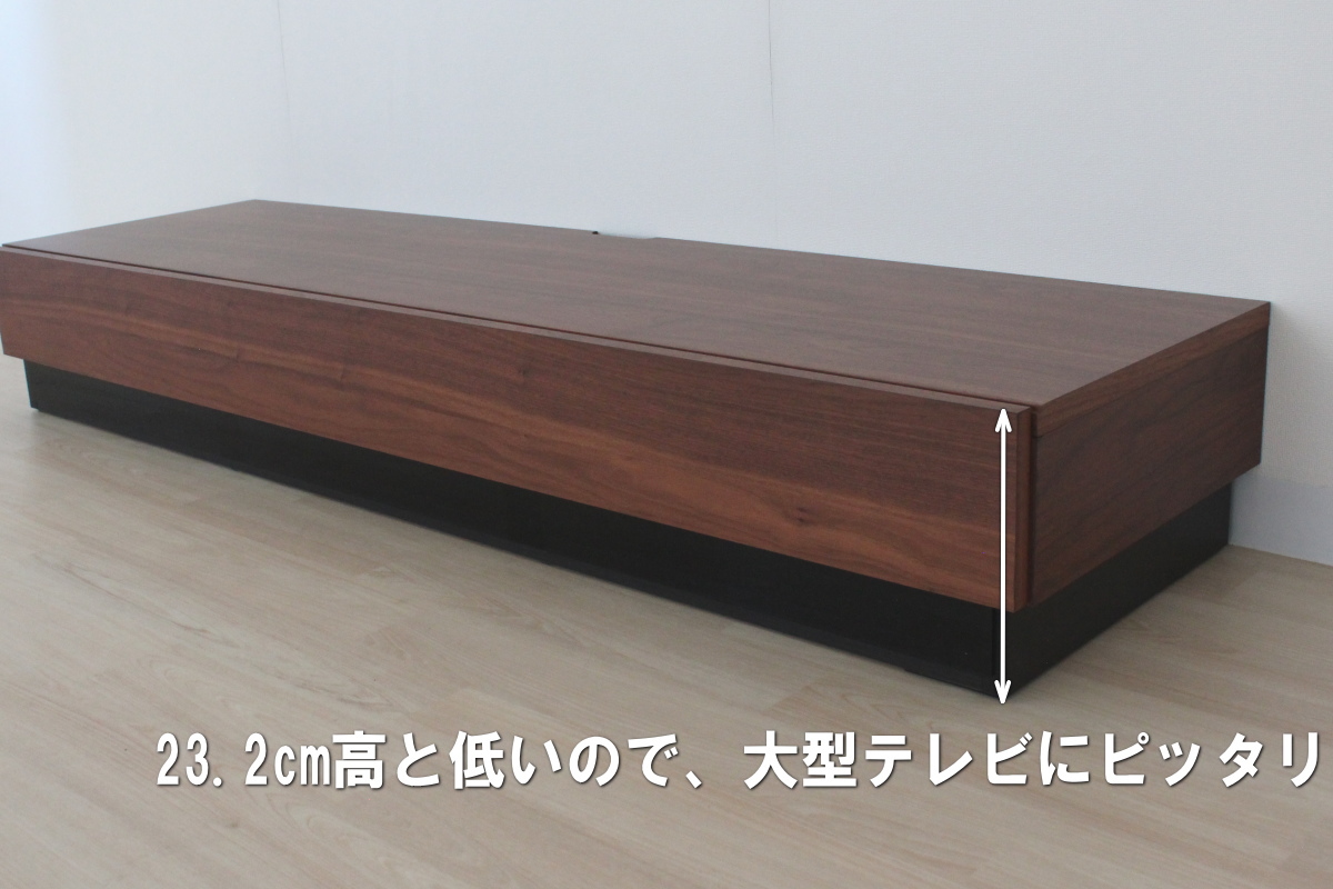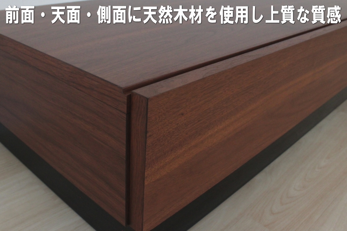商品特徴 1、外観は天然木つき板のシンプルで上質な佇まい 2、天板、前面だけでなく側面にも天然木つき板を使用 3、23.2cm高と低いので、大型テレビでも見上げなくていい 4、引出し内部も黒塗装し、デザイン的統一感 5、内部は引出しとデッキスペースで収納も万全 だから、 大型テレビを置くのに圧迫感のない上質な空間にしたい方にピッタリ ・外観は天然木つき板のシンプルで上質な佇まい このテレビボードは、天然木つき板を見える範囲に使用していますので、 デザインをシンプルにし、天然目の良さを活かせるデザインになっています。 ・天板、前面だけでなく側面にも天然木つき板を使用 前面だけでなく、天板、側面も天然木つき板を使用。 通常設置時に見える範囲はすべて天然木ですので、 上質なインテリアにピッタリです。 ・23.2cm高と低いので、大型テレビでも見上げなくていい このテレビ台の高さは23.2cmと低めに作られています。 昨今の大画面テレビでテレビ台の高さが高いと見上げる形になり、 首が疲れたり目に良くなかったりするので、 低めに作りテレビ視聴時の疲れを低減しています。 ・引出し内部も黒塗装し、デザイン的統一感 前板下部はブラックガラス、本体内部もブラック色にし、 前板を締めたときにテレビ台が浮いているような感じにしています。 また、ブラックガラスなので、リモコンも使えます。 ・内部は引出しとデッキスペースで収納も万全 前扉内は、中央引き出し、両サイドがデッキスペースになっています。 引き出しはDVDやブルーレイを背表紙を上にしてぴったり収まる高さに。 デッキスペースの内寸高は19センチありますので、 背が高めのAVアンプなども収納できます。 (ご自身のデッキのサイズをご確認ください) また、背面があいてますので、排熱や配線効率にも優れてます。 天板前面は無垢材を使い、L 字加工しています。 これは、前板の手がかりが良くなるのと、 質感、デザイン工場のために施されています。 レイリーシリーズの過去の質問