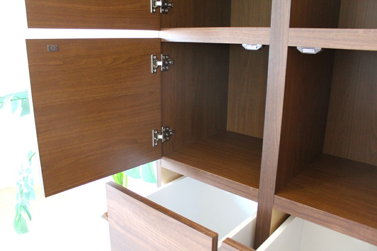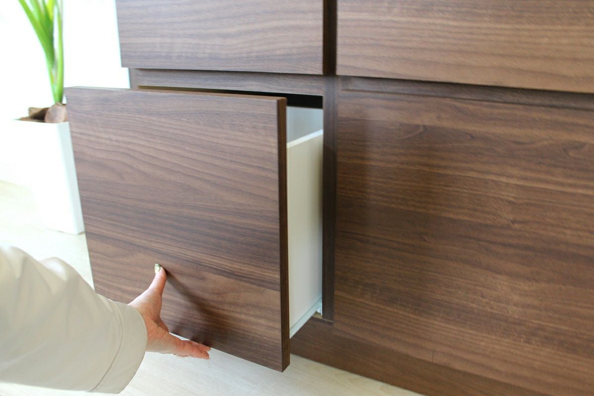 テーブルの天板やキャビネットで裏側も化粧仕上げをし、背面が見えてもおかしくない商品。