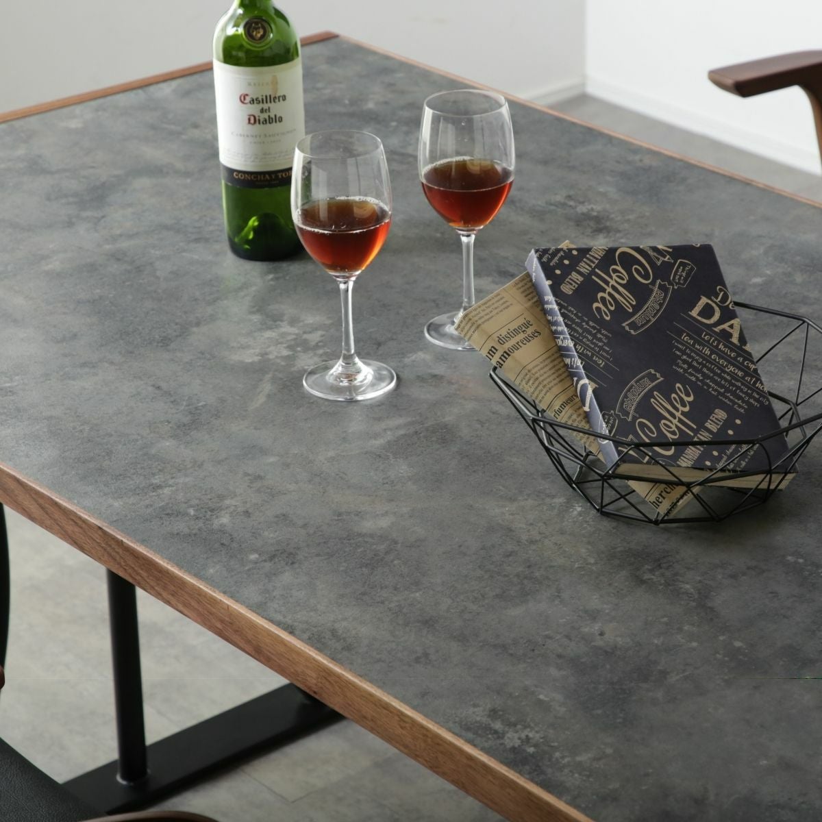 無垢材を薄くスライスした天然木を基材に貼り、天然木の風合いと無垢の弱点の反り割れ防止を両立した素材。