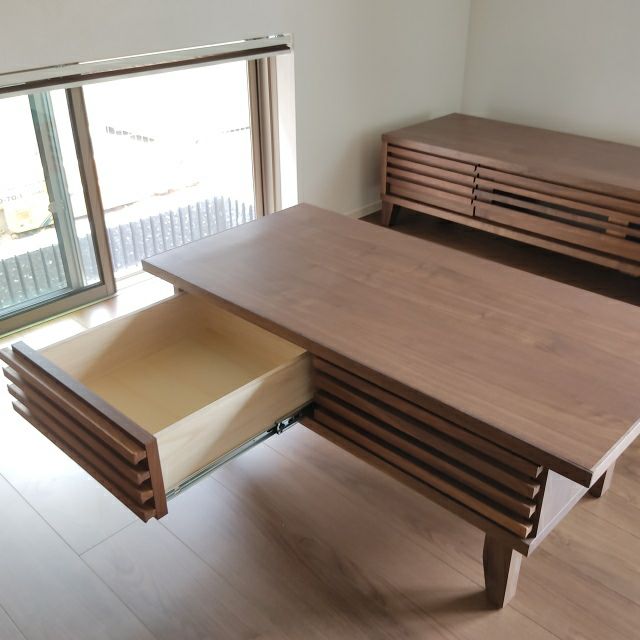 テーブルの天板やキャビネットで裏側も化粧仕上げをし、背面が見えてもおかしくない商品。