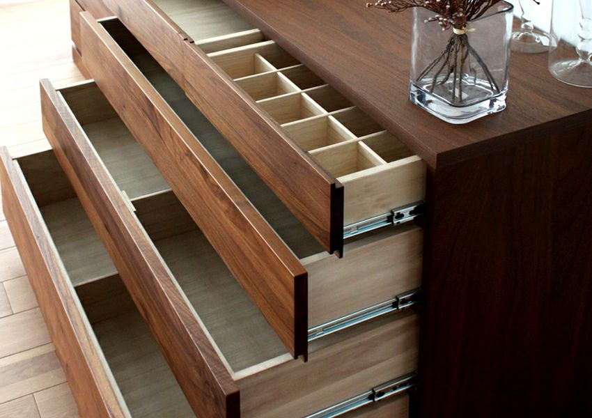 テーブルの天板やキャビネットで裏側も化粧仕上げをし、背面が見えてもおかしくない商品。